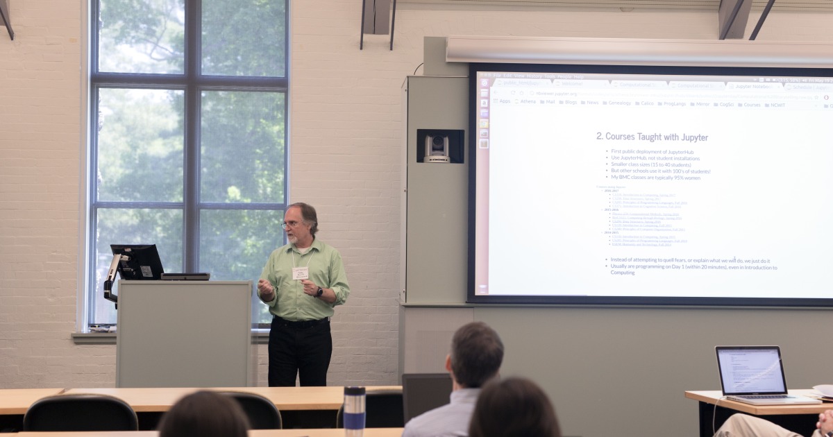 Most speakers emphasized the usefulness of having narrative and computational forms closely intermingled, as they are in Jupyter Notebooks. Doug Blank [SLIDES] from Bryn Mawr's computer science program stated that the notebooks are especially useful for novice learners trying to get past the first hurdles of coding: "Instead of attempting to quell fears, or explain what we do, we just do it" says Blank.