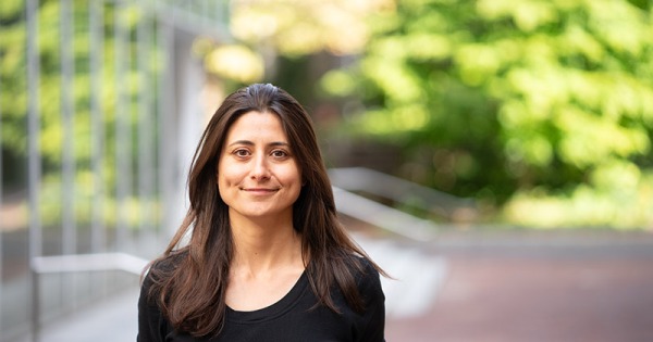 Arwa Mahdawi standing outside in front of building and trees