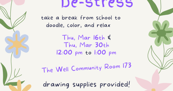 Get creative and join the Health and Wellness Center for a break from school to relax while doodling and coloring. This will be the final session of the school year. Drawing supplies and pizza provided!