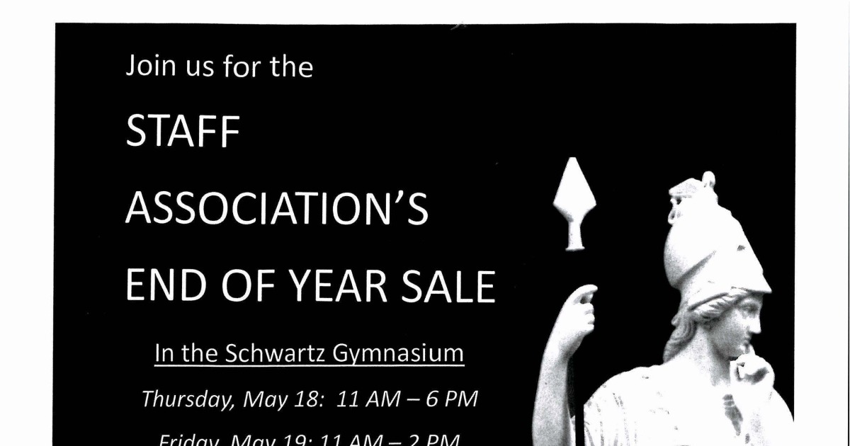 The Staff Association’s End-of-Year Sale is an annual event made possible by the cooperative efforts of Staff volunteers, Housekeeping, and Public Safety and community partners. Since it began in 1997-98, the EOY Sale has kept thousands of pounds of belonging out of the dumpster and in the hands of community members who can use them. The revenue from the sale funds the Staff Association’s projects and initiatives for following year.