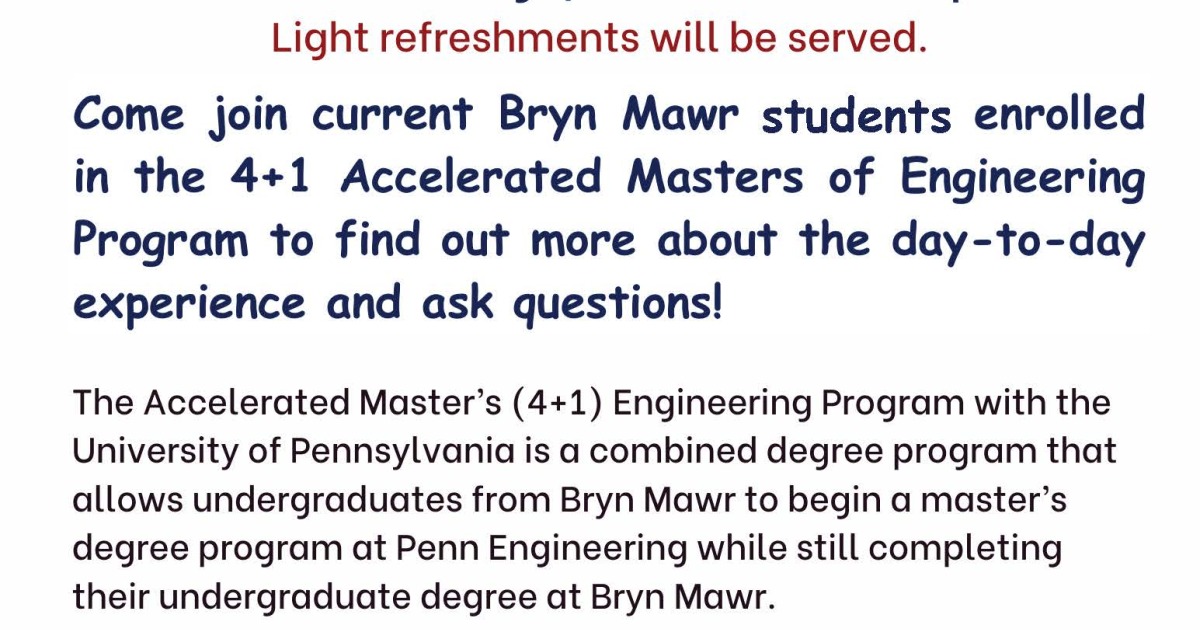 New Date! Current 4+1 Students Q&A for students interested in applying to the Accelerated Masters Program with University of Pennsylvania School of Engineering. Light refreshments will be served.
