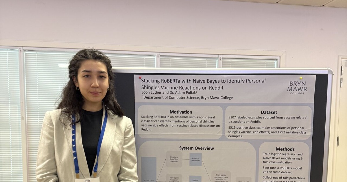 At Bryn Mawr, a spark of encouragement from a faculty member can ignite confidence for a student to pursue unique opportunities. In spring 2025, Assistant Professor of Computer Science Adam Poliak invited Joon Luther '25, a computer science and mathematics double-major in his computer science senior seminar, to collaborate on a Social Media Mining for Health/Health Real-World Data 2025 Shared Task.