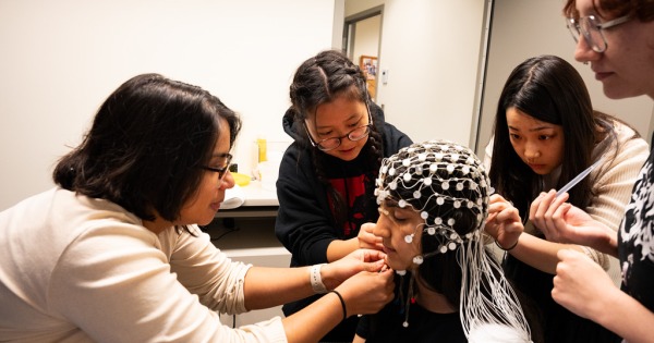 Assistant Professor of Psychology Cora E. Mukerji and Summer Science Program students practice collecting electroencephalogram (EEG) data.