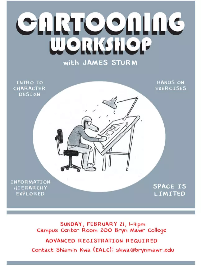 Cartoonist James Sturm, co-founder of the Center for Cartoon Studies in White River Junction, Vermont, and founder of the National Association of Comics Art Educators (NACAE) will be coming to Bryn Mawr to offer a cartooning workshop to students interested in making their own comics. No expertise is required, but space is limited!