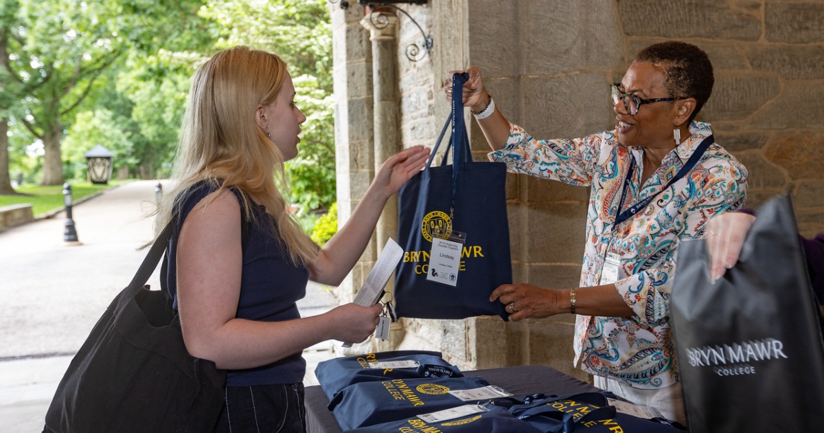 Bryn Mawr’s Chief Enrollment Officer Cheryl Lynn Horsey checks a student in.