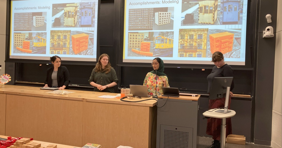 Faculty members Margaret Strair and Irina Walsh presented their project, in which they’re creating a 3D map of Berlin before the fall of the wall to be used in future German and Russian courses. Working on the project with Strair and Walsh are: McGrath, Tessa Eisen '23, Jeff Hopkins, and Bronwen Densmore from LITS; Ph.D. candidate Alexis White; Mads Muller '25, Margaret Schedler '27, Yunisha Neupane '28, Eman Rasool '28, and Chloe Stephenson-Brown '26. While Muller and Schedler spent the week scanning historical maps and curating content for the digital map, other team members began prototyping 3D printed buildings and tracing out maps for the laser cutter.