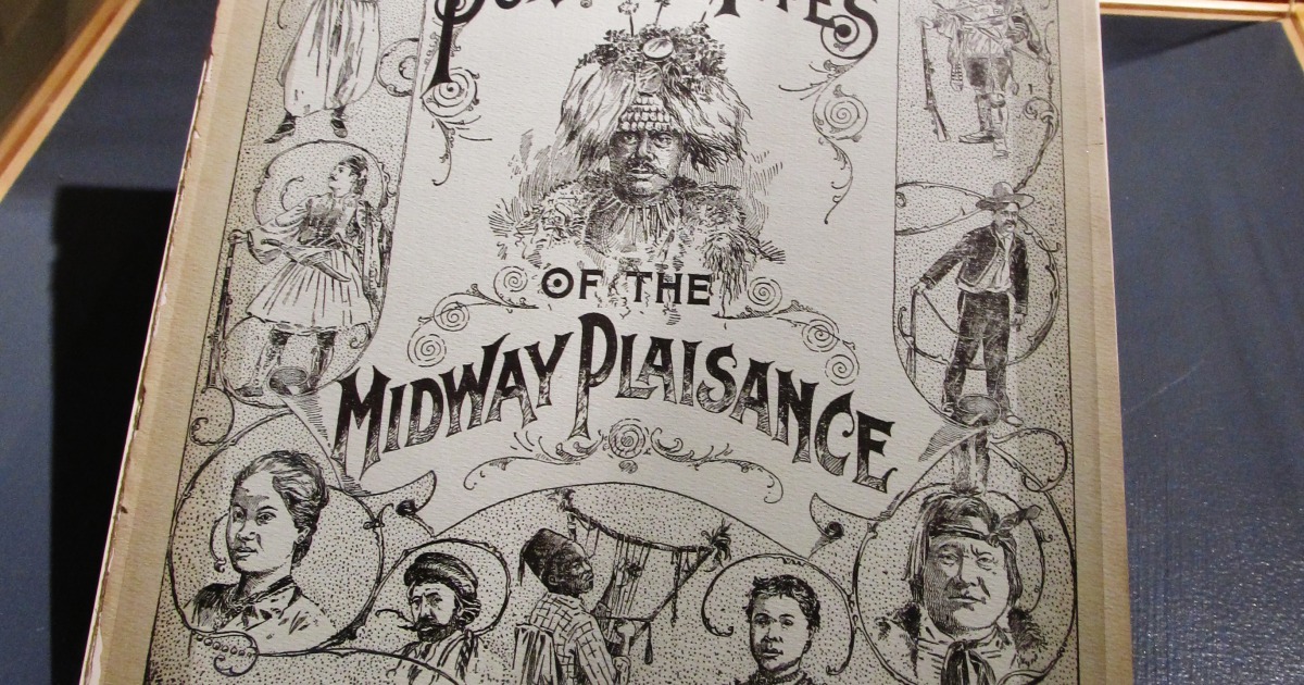 A main feature of the exhibition is a wall of photographs taken from “Portrait Types of the Midway Plaisance.” Produced by a Harvard trained ethnologist, the photos featured pseudo-scientific captions with “sweeping generalizations and racial epithets,” say the curators.