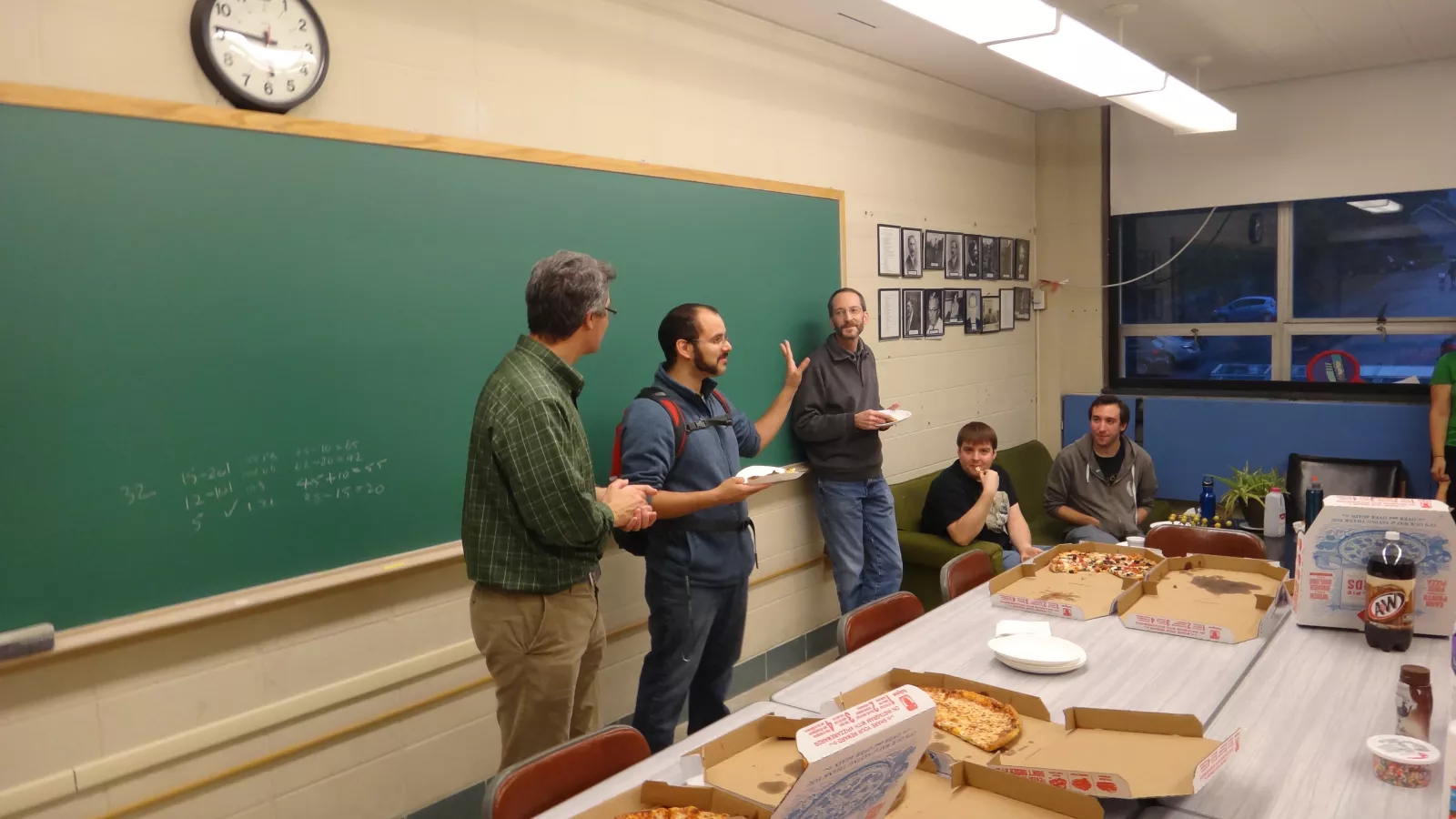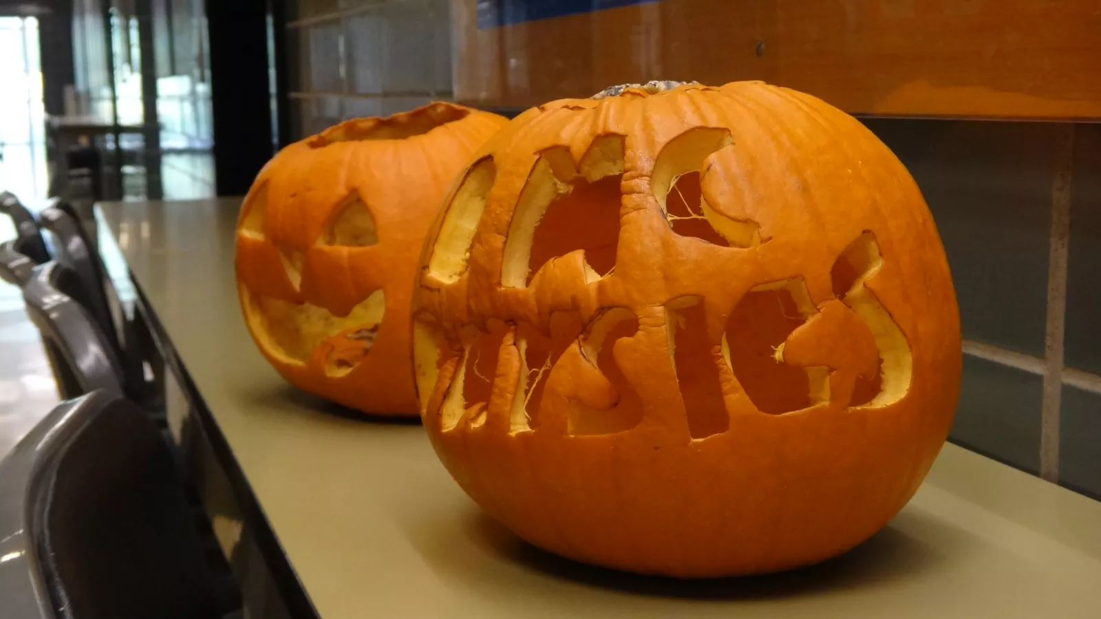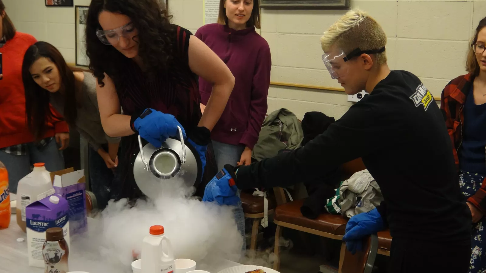 The physics department gathered once again this Halloween to carve pumpkins and eat liquid nitrogen ice cream. Senior reps Lindsey Marinello and Codie Fiedler-Kawaguchi led the chilly cooking session by pouring liquid nitrogen into a large bowl of cream and sugar. The result is an instant ice cream!. The remainder of the guests went around and introduced themselves, including the faculty. Then the pumpkins and the pizza were distributed and the carving began.