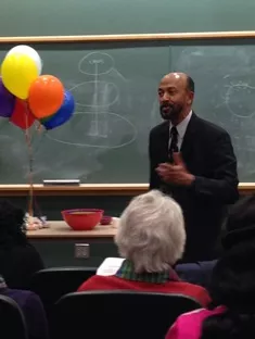 Professor Michael Allen was named The Harvey Wexler Chair in Economics, History, Philosophy and Political Science at the 2014 Commencement. In this photo, he delivers the Wexler Chair lecture "Creating Coherence: Global Ontologies and the Re-Contextualization of the Academy."