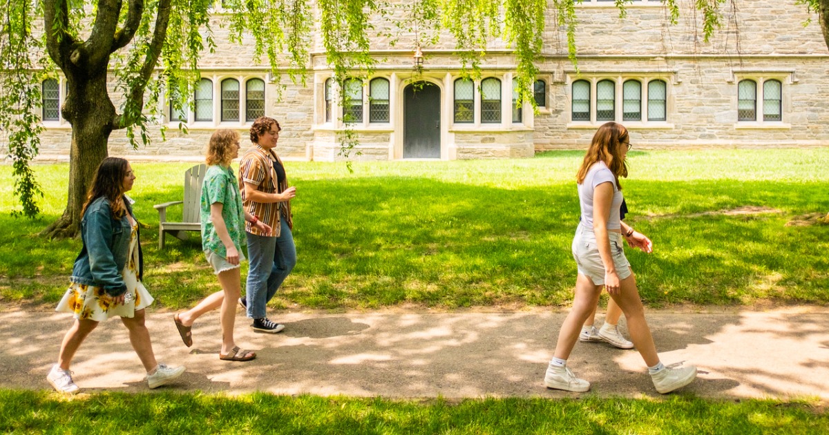 A typical Bryn Mawr tour is about an hour. Your tour guide will take you on a beautiful loop around campus, going up and down our “Big Hill.” (Fun fact: Bryn Mawr means “Big Hill” in Welsh!) You’ll be sure to enter an academic building and peek into classrooms; visit a common room in one of our dorms; walk around our campus center (where you’ll spot our on-campus cafe); and see our gorgeous outdoor spaces, such as the Cloisters and Sunken Garden.